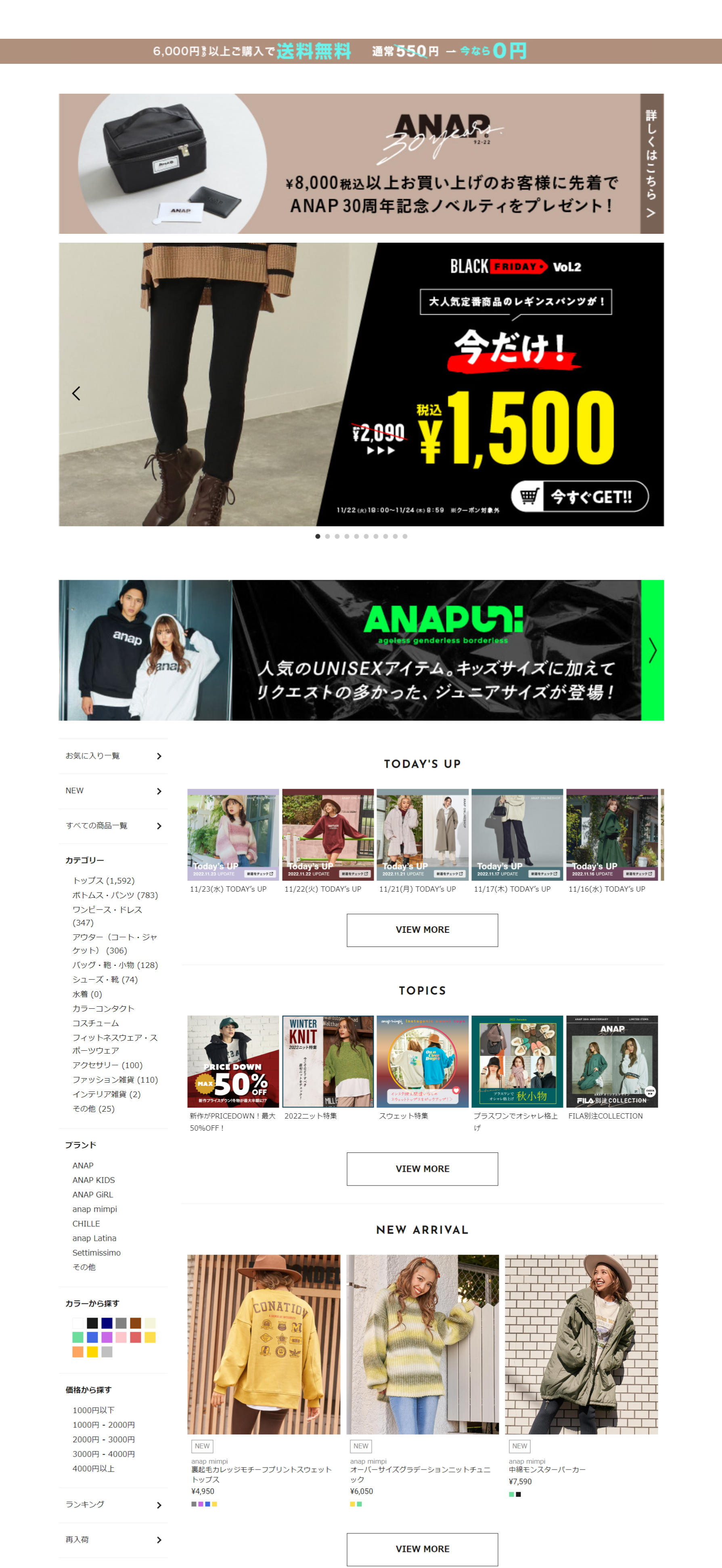Elementor #1272 コメントする / 通販 ファッション通販サイト【ANAP(アナップ) 詳細はこちら ◆セールスポイント◆ レディースファッション通販「ANAP]の公式通販サイト。 豊富なジャンルと圧倒的なアイテム数で個性的なスタイルを追求できるファッションサイト。 低価格でありながらディティールにこだわったアイテムをたくさん取り揃えてます。 キッズからレディースまで品揃えが豊富なので、親子コーデや姉妹コーデなど、リンクコーデも楽しめます♪ ◆ターゲットユーザー◆ 10代〜30代の女性を中心にご好評いただいております。 現在のメインターゲットはママさんが多いです。 ◆おススメの提案の仕方◆ (1)最新トレンドファッションがプチプラでGET出来る♪